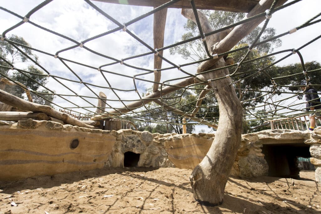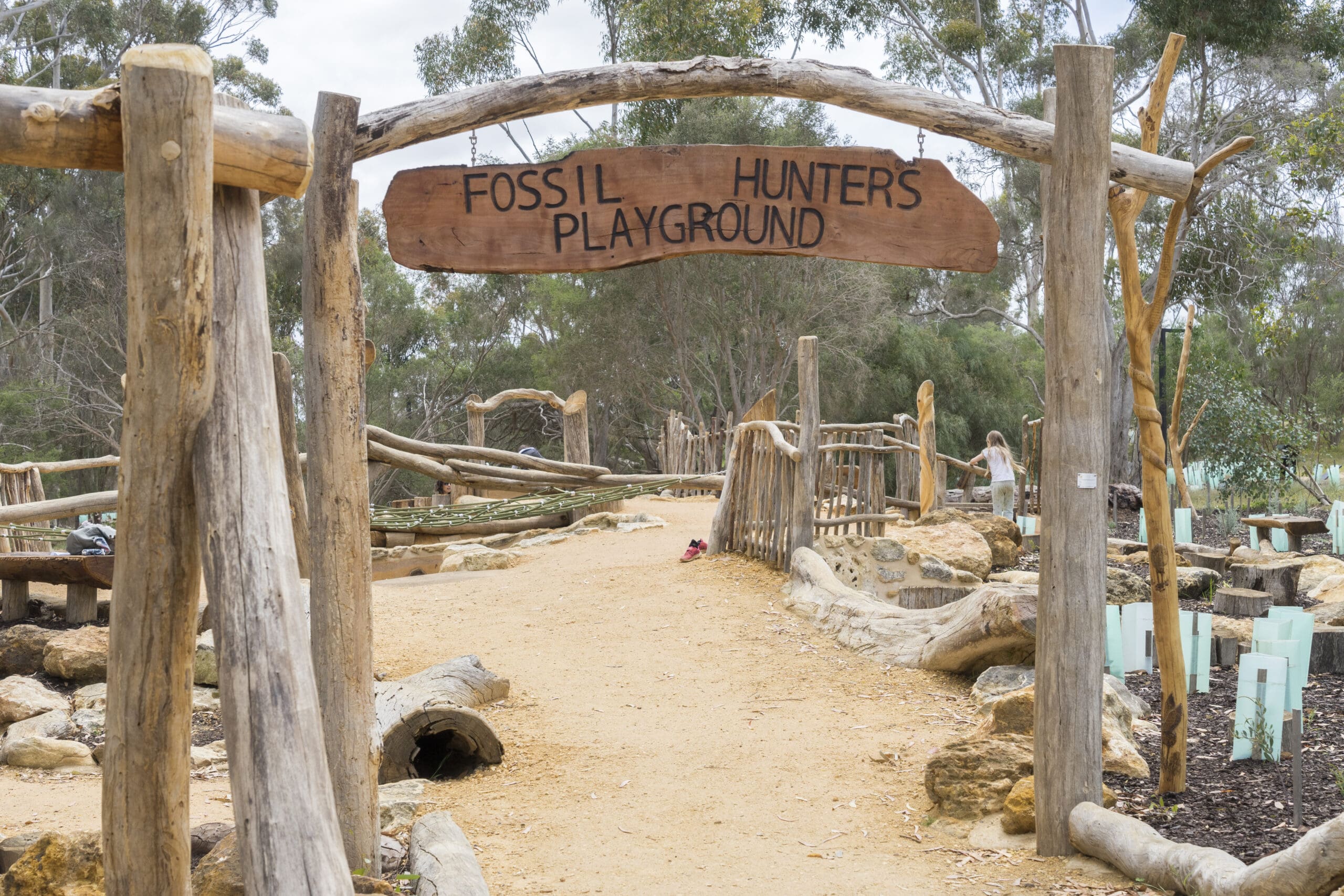 The Naracoorte Fossil Hunters Playspace is a multi-award winning playspace situated at the Naracoorte Caves, South Australia’s only World Heritage-listed site. The site sits in a depression and has a number of significant trees surrounding it. The design incorporated a welcoming path defined by two stone snakes but hides most of the play elements below or behind the mound which only become evident as the visitors ascend the hill. The design reflects the nearby caves consisting of a central sink hole with multiple tunnels leading out to different spaces. These tunnel systems allow children to go over, under and through the space being lost and found as they travel through. The design also incorporates a wide steel slide , a basket swing, cubby frames, balance logs and limestone boulders. A log scramble sits over an intricate rope net and a beautifully designed learning circle and story-telling chair allows a unique space for sharing of knowledge and history.